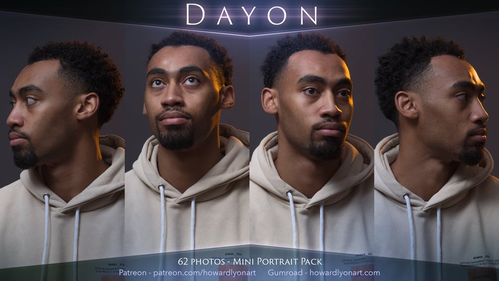 In this reference set, you get 62 images of Dayon. Dayon came to my studio with Jazz, a professional ballet dancer who modeled for a previous set. I asked him if he would also model for a quick rotation of portrait photos for studies. I think you're going to enjoy painting and drawing from these photos. Thank you, Dayon, for being willing to sit for a few portraits!