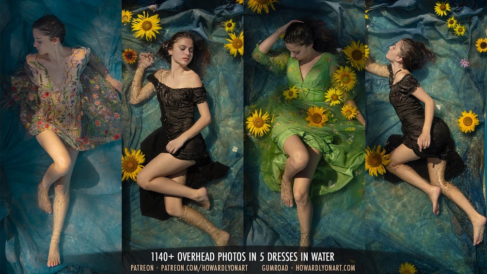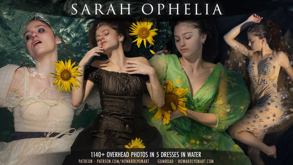 Sarah is back! I am so thrilled with this set. It was more than a year in the making, gathering the supplies and hardware I needed to safely shoot with my camera above Sarah in the pool. I also grew the flowers for the shoot. Sarah was amazing. It is taxing to lay in the water, in the sun for a few hours and it took a couple tries while we figured out how to warm the water enough and how to discreetly keep water out of her ears, among other challenges.