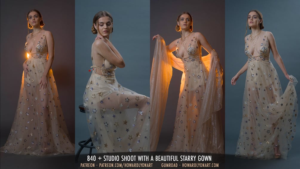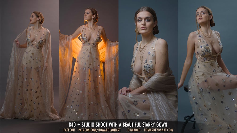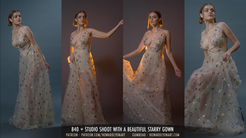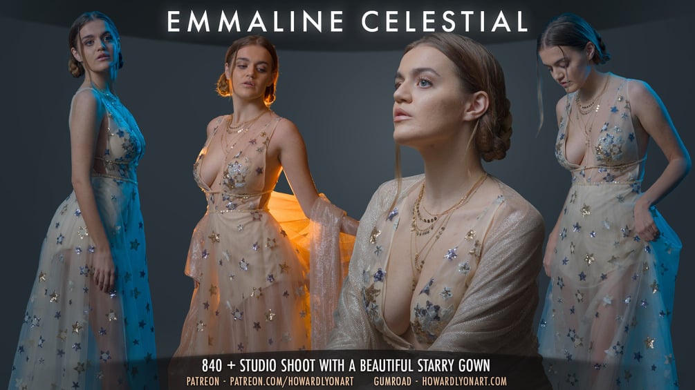 Emmaline is a new model and she brings many beautiful poses and lines to this set. Once again we have the starry dress that you've seen in other celestial sets. I shot in a variety of lights for this one and I think you'll find it challenging in the best way.