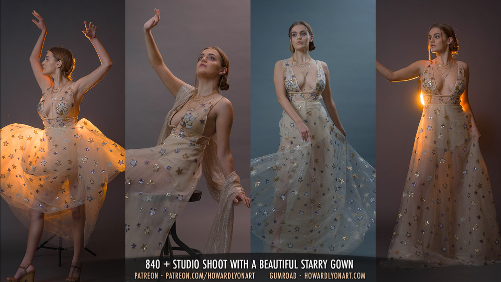 Emmaline is a new model and she brings many beautiful poses and lines to this set. Once again we have the starry dress that you've seen in other celestial sets. I shot in a variety of lights for this one and I think you'll find it challenging in the best way.