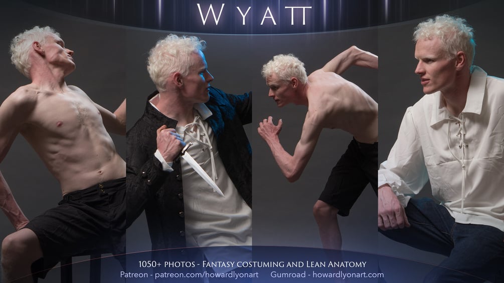 In this reference pack, you get over 1050+ images of Wyatt. Wyatt is incredibly lean and has great chiseled features. This set has a range of head rotations, costumed poses with a sword and dagger as well as some great images with upper body anatomy and dramatic lighting to better accentuate his physique.